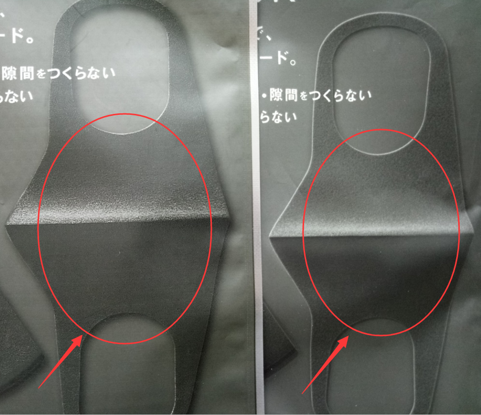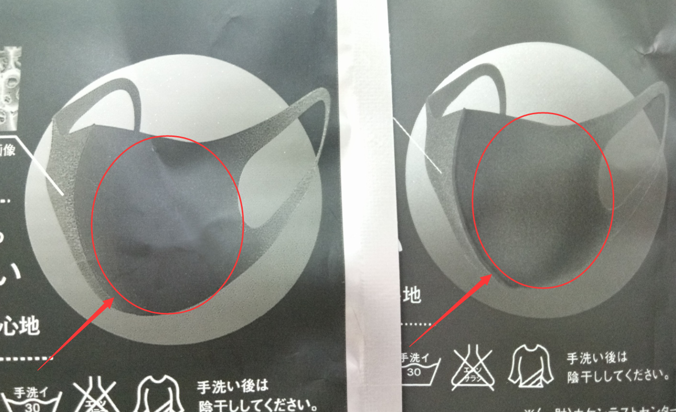 仿品:有一種東施效顰的感覺,完全忽視細節(jié),背面的口罩小圖案直接用的P圖工具做的色彩漸變,是一整個色