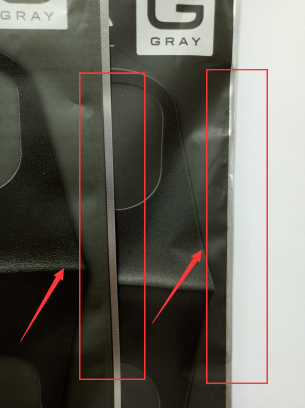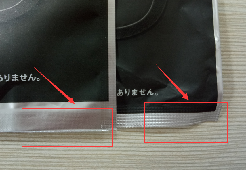 正品:自封口邊緣壓邊面積小幾乎沒有壓邊;包裝袋側邊封邊采用熱切法,邊緣幾乎無壓邊。